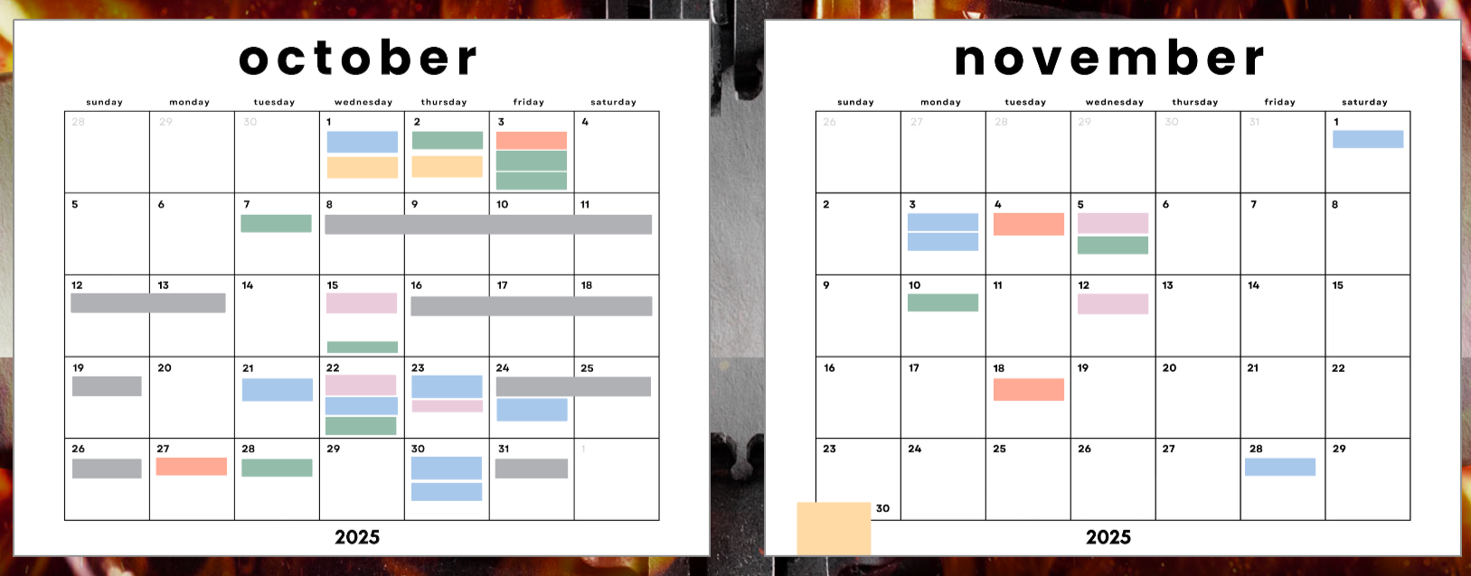 I’ve created a color-coded launch calendar (text removed so as not to give away any surprises). Everything has a margin of error just in case things don’t go as planned. My buffers have buffers.