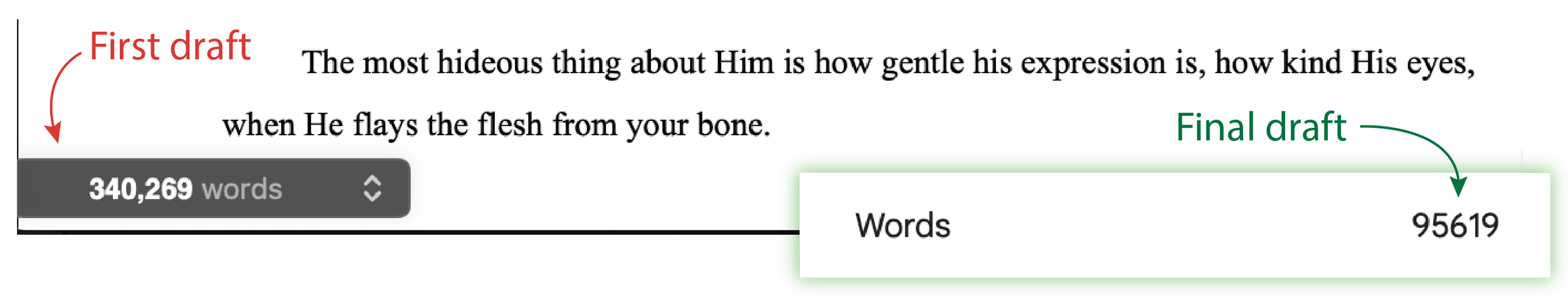 And now, in a few short months, I’ll be able to hold it in my hands. However many copies I sell, however many people read it, whatever reviews I get, it will be a real solid object that I wrenched out of my subconscious piece by piece over more than a decade and chiseled from 340,269 words (the meandering, way-too-long first draft) to 95,619 words (its current nearly-ready-to-print incarnation).